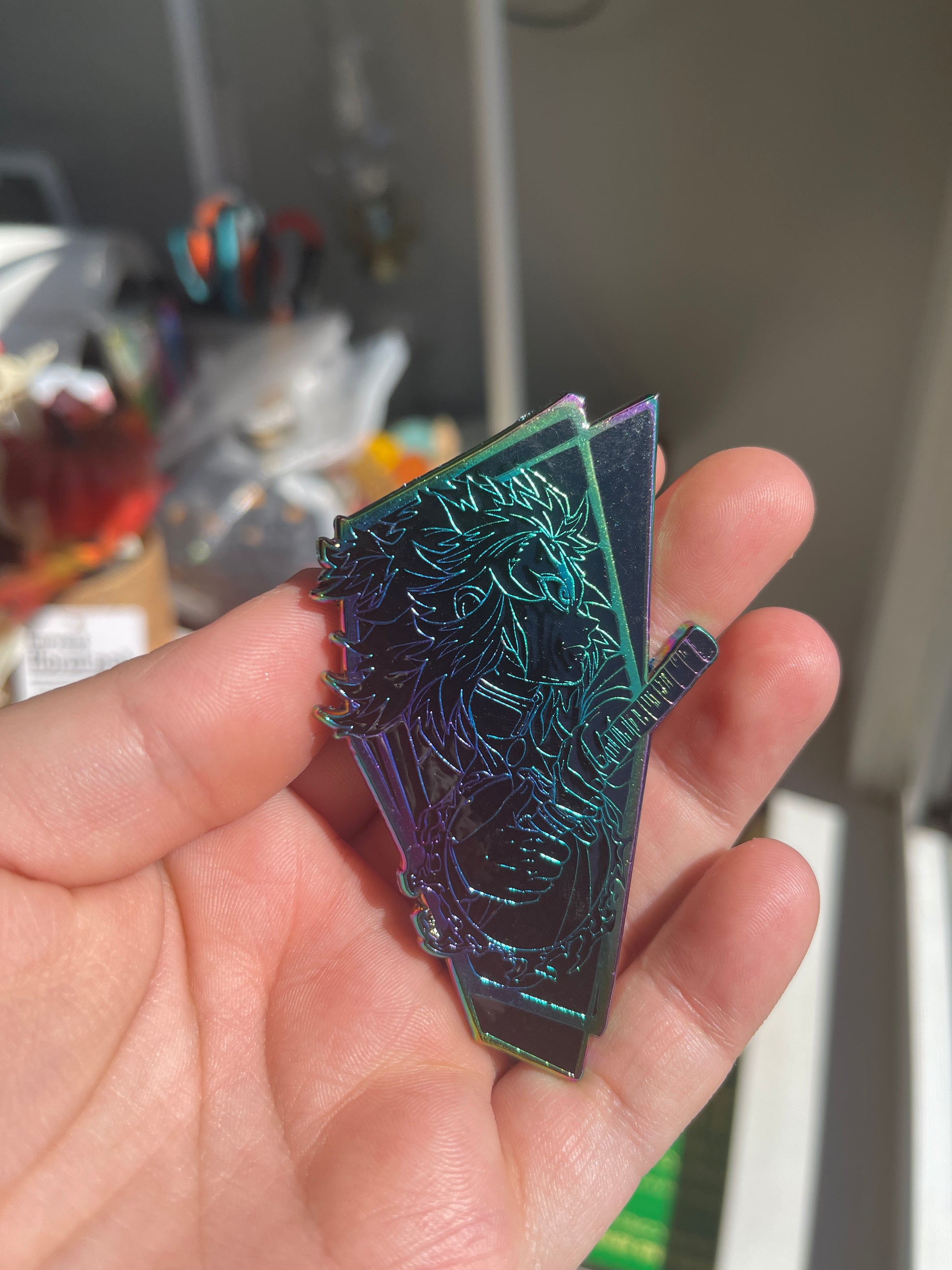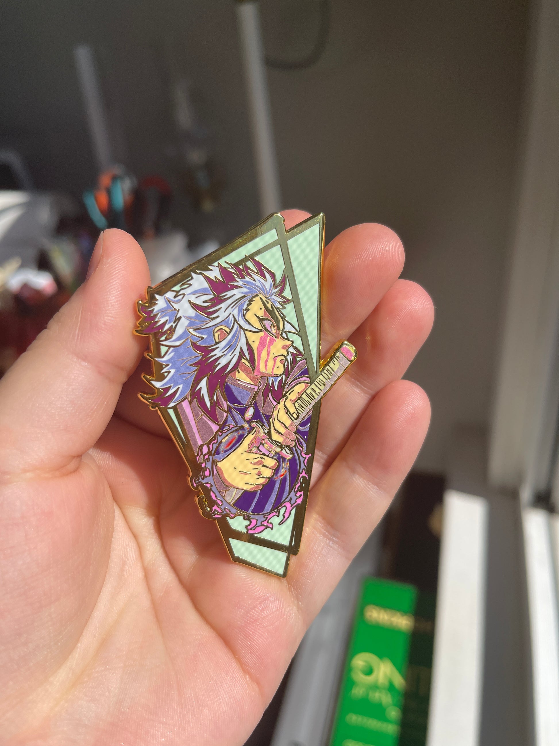 This is a 3 inch enamel pin with screen print.